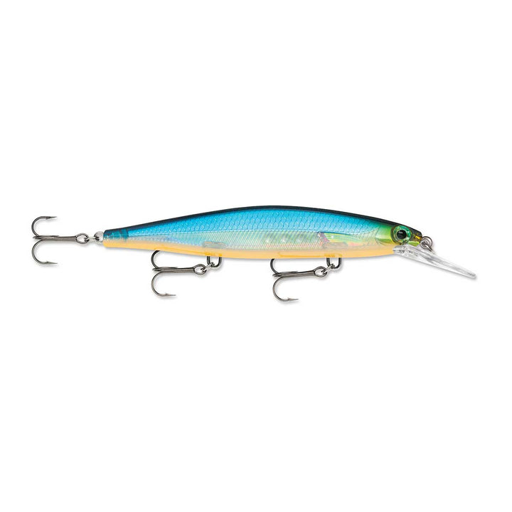 The Shadow Rap Deep combines a horizontal struggle with a vertical fade that perfectly mimics a minnow in trouble in the 4-8 foot depth range. Rapala has perfected the natural minnow action in this new jerkbait that triggers fish in three ways: on the kick, on a slow fading fall and on the snap back to life. Most jerk baits continue on a forward plane with each jerk. Not the Shadow Rap Deep. It kicks almost 180 degrees right then left, so it can be fished nearly in place with very little forward travel, keeping the flickering fade right in a fish's strike zone.